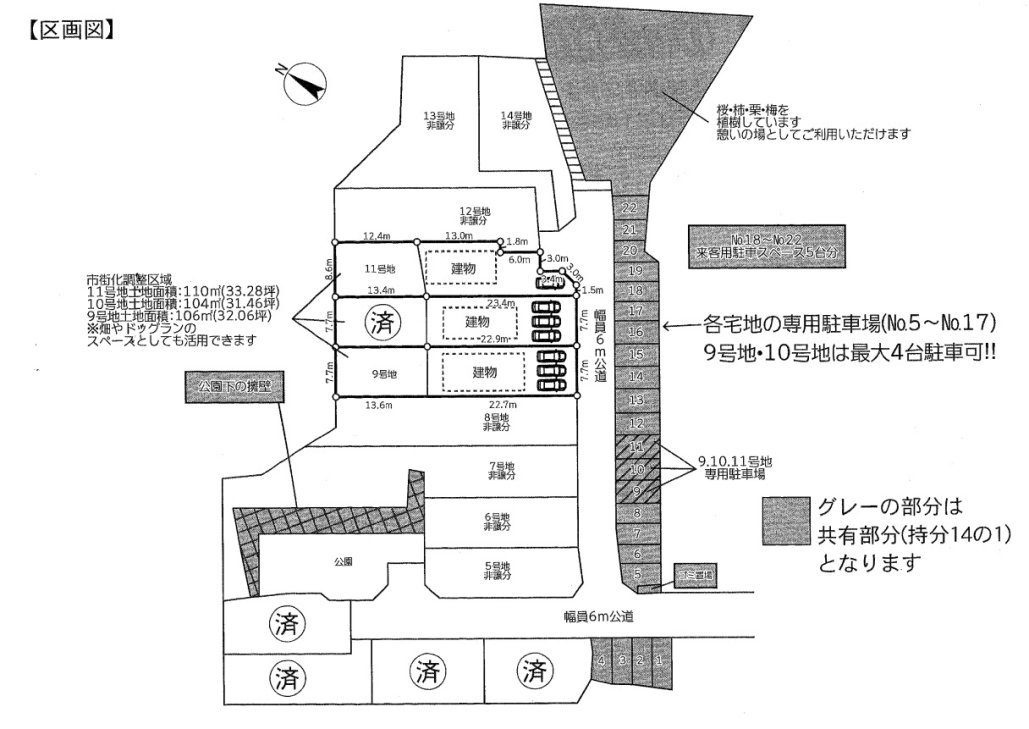 | 備考 | ・都市計画計画:市街化区域、一部市街化調整区域 ・地目:宅地、原野 ・市街化讕鏊区域 11号地工地面積:110m(33.28坪) 10号地土地面積:104m(31.46) 9号地土地面積:106m(32.06坪) ※畑やドッグランのスペースとしても活用できます |