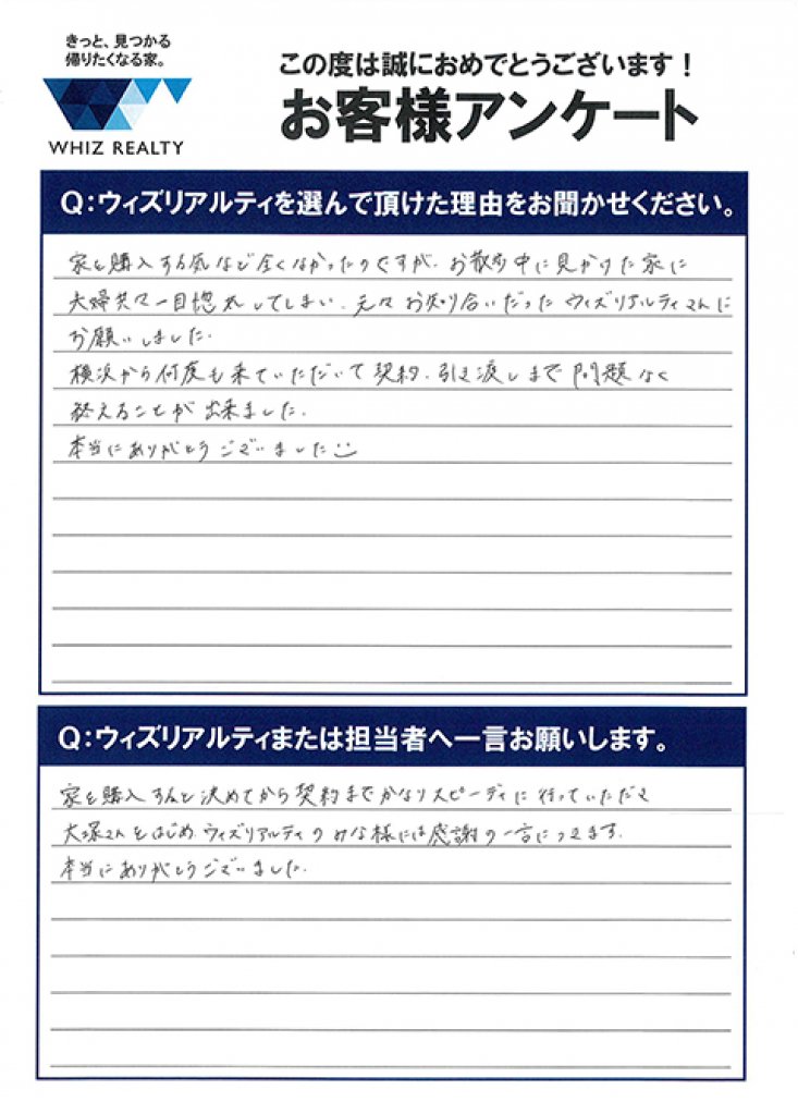 - 家を購入すると決めてから契約までかなりスピーディーに行っていただき大塚さんをはじめウィズリアルティのみな様には感謝の一言につきます。