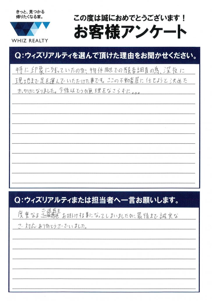 - 特に印象に残っていたのが、物件周辺での騒音調査の為、深夜に現地まで足を運んでいただけた事です。ここの不動産屋に任せようと決めたきっかけになりました。今後はどうか無理をなさらずに。