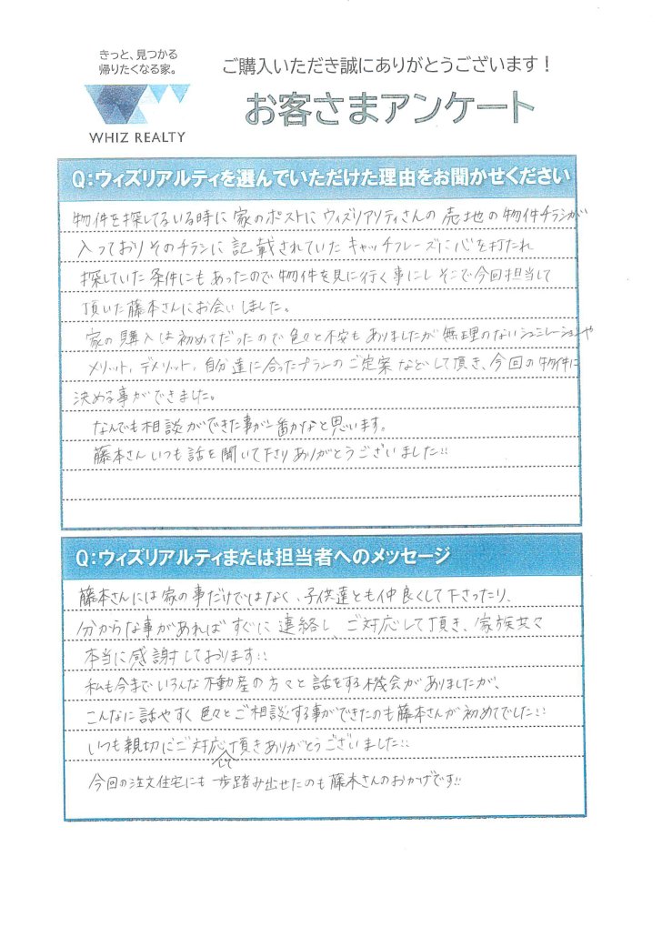 - 物件を探してるいる時に家のポストにウィズリアルティさんのた売地の物件チラシが入っておりそのチラシに記載されていたキャッチフレーズに心を打たれて探していたしいた条件にもあったので物件を見に行行く事にしそこで今回担当いて頂いた藤本さんにお会いしました。