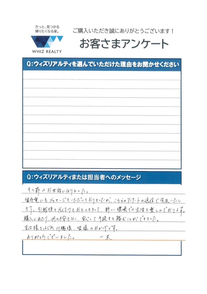 「吉江様をはじめ、川端様、皆様のおかげです。」 2025.11.10 横浜市西区 I様 Q2:Q:ウィズリアルティまたは担当者へのメッセージ その節はお世話になりました。 留守電にもメッセージをいただいておりましたが、こちらのアンケートの返信で失礼いたします。 引っ越し後の片付けもおちつきまして、新しい環境での生活を楽しんでおります。 購入にあたり、何の不安もなく、安心して手続きを踏むことができました。 吉江様をはじめ、川端様、皆様のおかげです。 ありがとうございました。 お客様の声一覧へ戻る