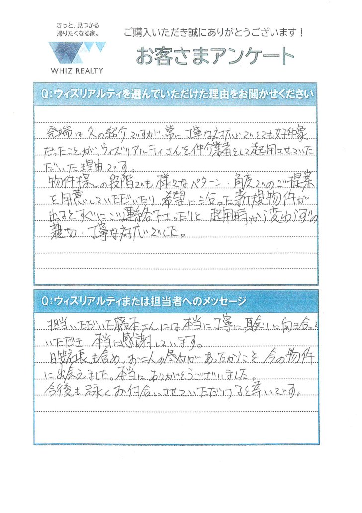 物件探しの段階でも様々なパターン・角度でのご提案を用意していただいたり、希望に沿った新規物件が出るとすぐにご連絡下さったりと起用時から変わらずの親切・丁寧な対応でした。 - Q2:Q:ウィズリアルティまたは担当者へのメッセージ