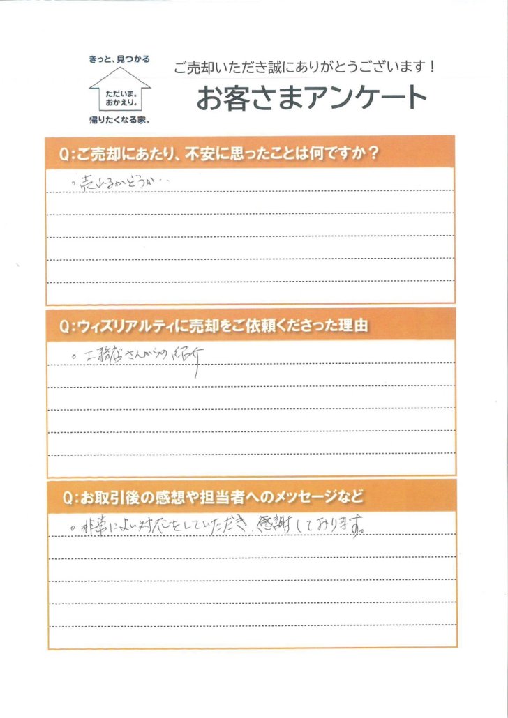 「吉江さんに非常によい対応をしていただき、感謝しております。」 2026.01.24 宮前区 S様 Q1:Q:ご売却にあたり、不安に思ったことは何ですか? 売れるかどうか、、 Q2:Q:ウィズリアルティに売却をご依頼くださった理由 工務店さんからの紹介 Q3:Q:お取引後の感想や担当者へのメッセージなど 非常によい対応をしていただき、感謝しております。 お客様の声一覧へ戻る